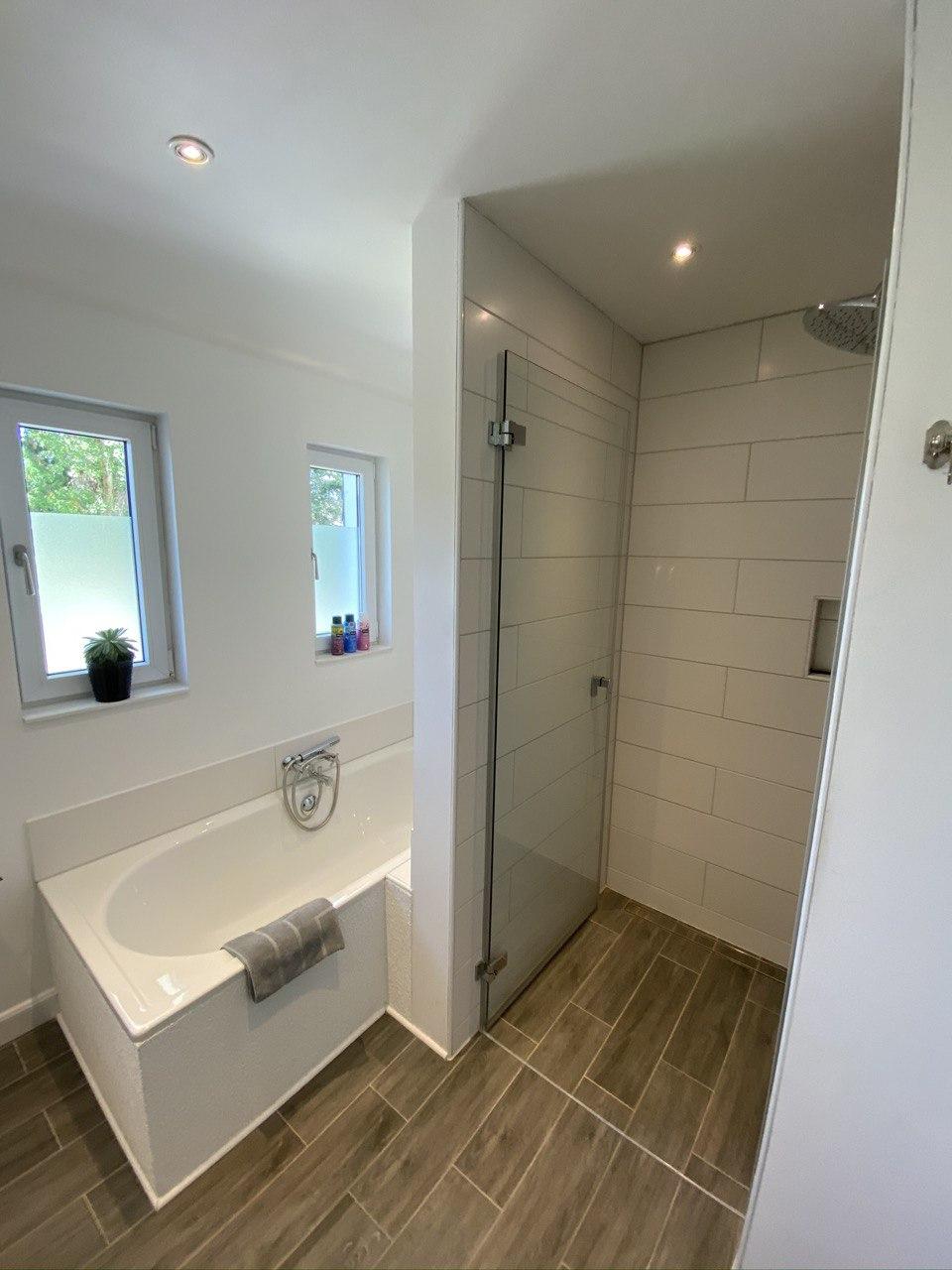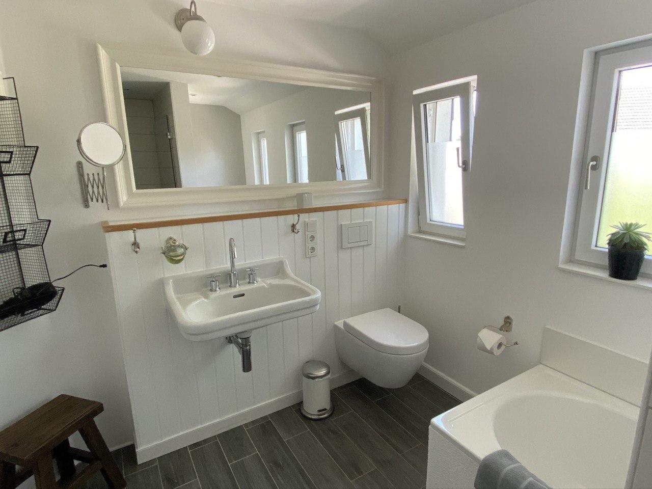 - 2 Badezimmer mit WC und Dusche, eine Badewanne, eine zusätzliche separate Toilette