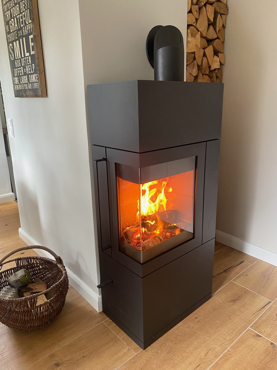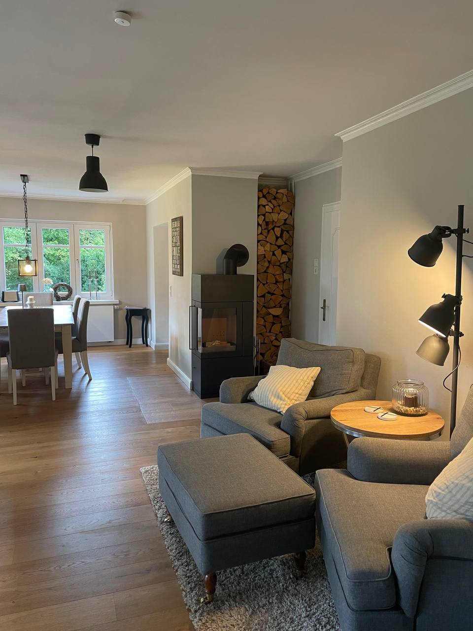 - moderner Kamin, Kaminholz und Anmachhilfen für den Anfang sind vorhanden